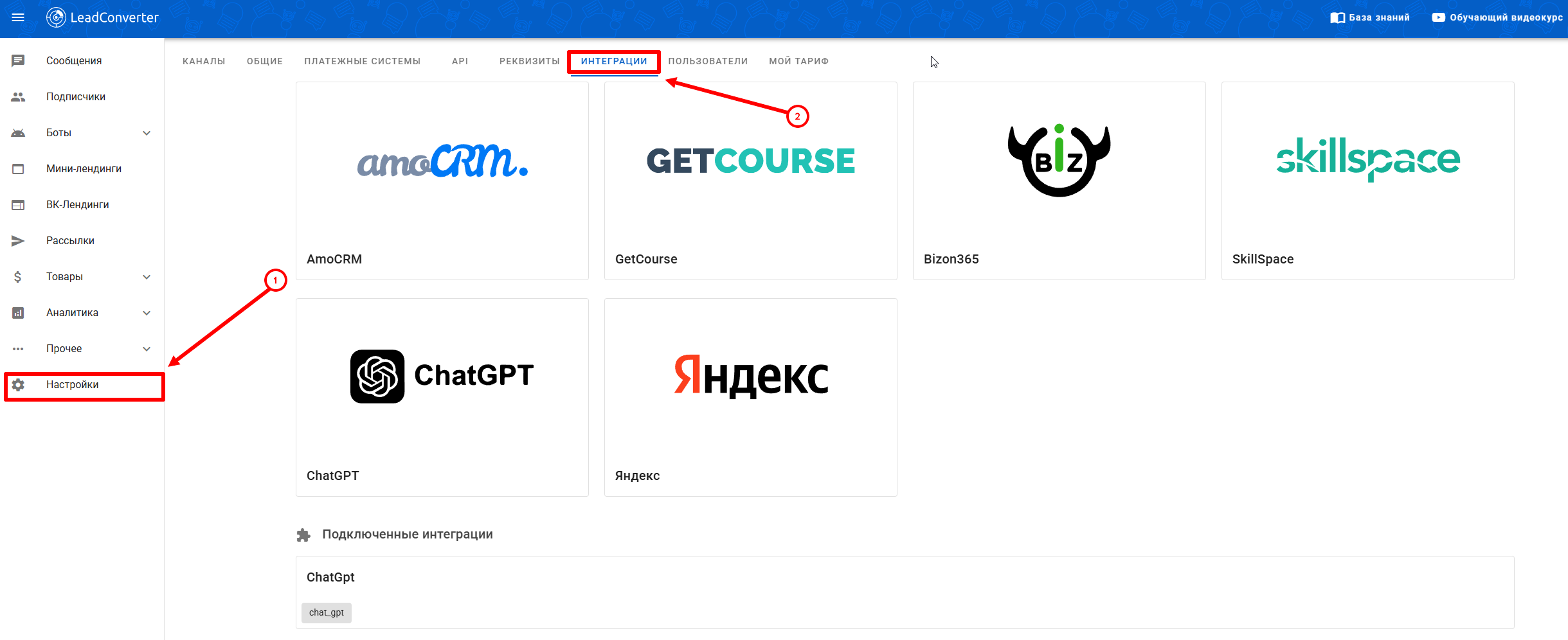 2. В разделе **«Настройки»** откройте вкладку **«Интеграции».**