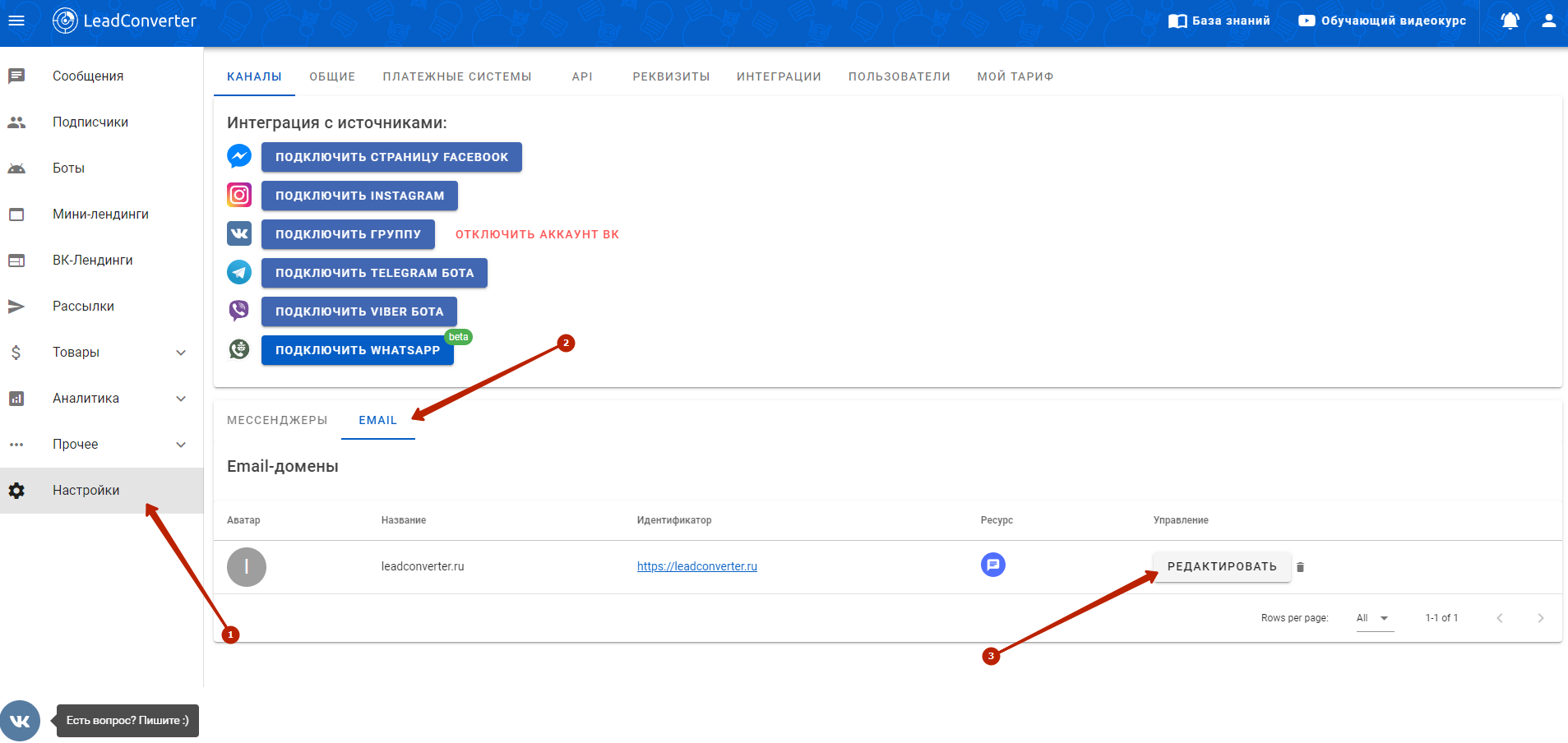 Для подключения **Email** канала связи в **LeadConverter**, потребуется домен (адрес вашего сайта), с помощью которого будет отправляться отправка писем.