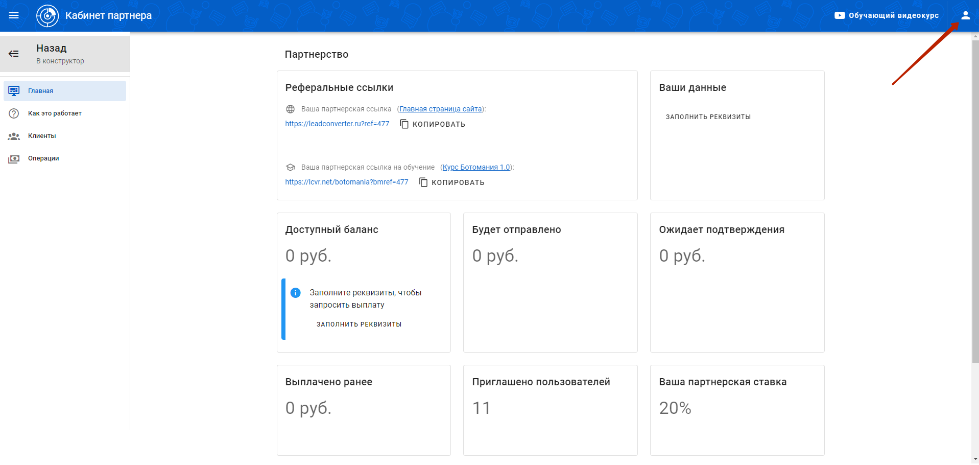 2\. В личном кабинете **LeadConverter** в правом верхнем углу нажать на иконку человечка.\