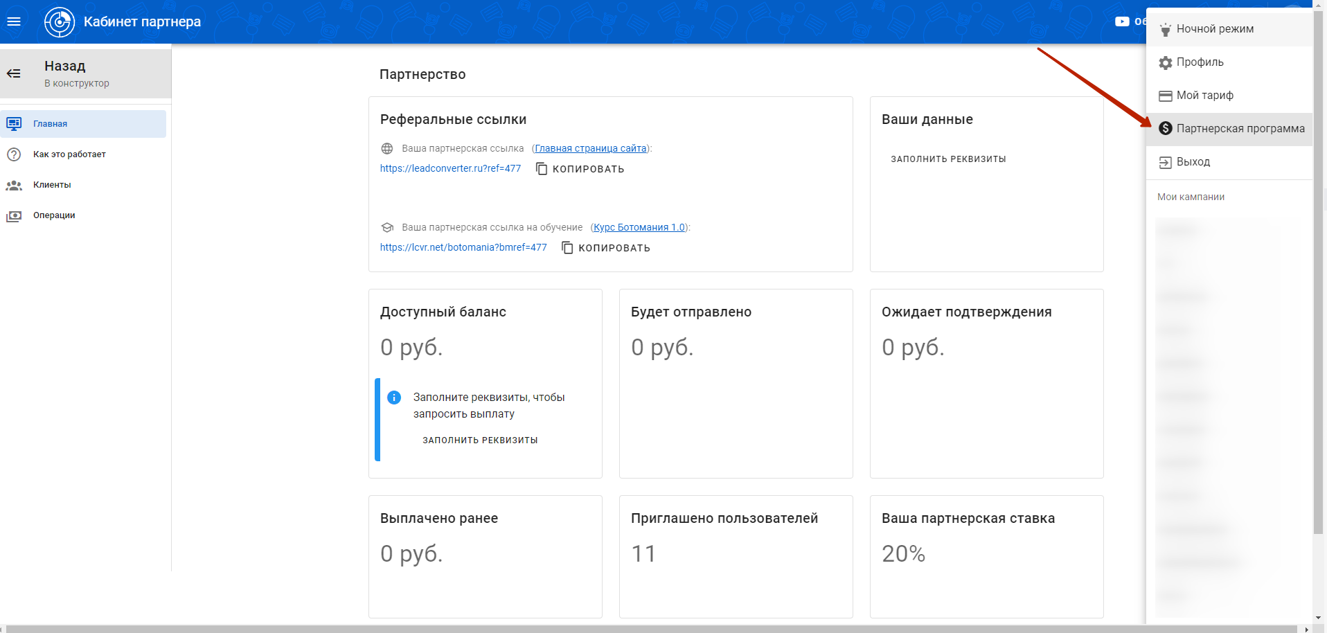 3\. В выпадающем меню выбрать пункт "**Партнёрская программа**".